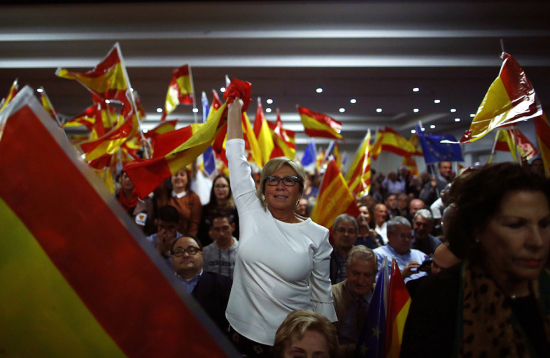图:巴塞罗那民众12日在拉霍伊的竞选活动上挥舞西班牙国旗/美联社