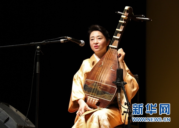 日本琵琶演奏家坂田美子在向现场听众介绍日本琵琶。新华网记者彭纯 摄