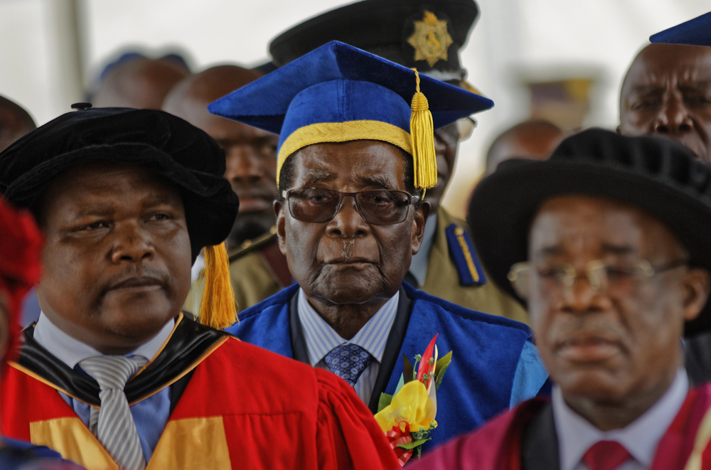 图:津总统穆加贝(中)17日在首都哈拉雷出席一场大学毕业礼/美联社