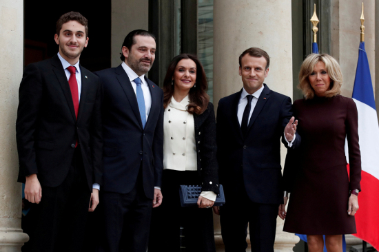 图:马克龙(右二)近日邀请黎巴嫩总理哈里里(左二)一家到访法国/路透社