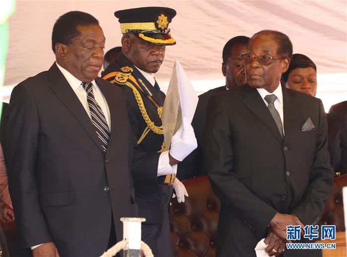 这是11月1日在津巴布韦首都哈拉雷拍摄的穆加贝(前右)和姆南加古瓦(前左)出席活动的资料照片。 新华社发(费列蒙 摄)