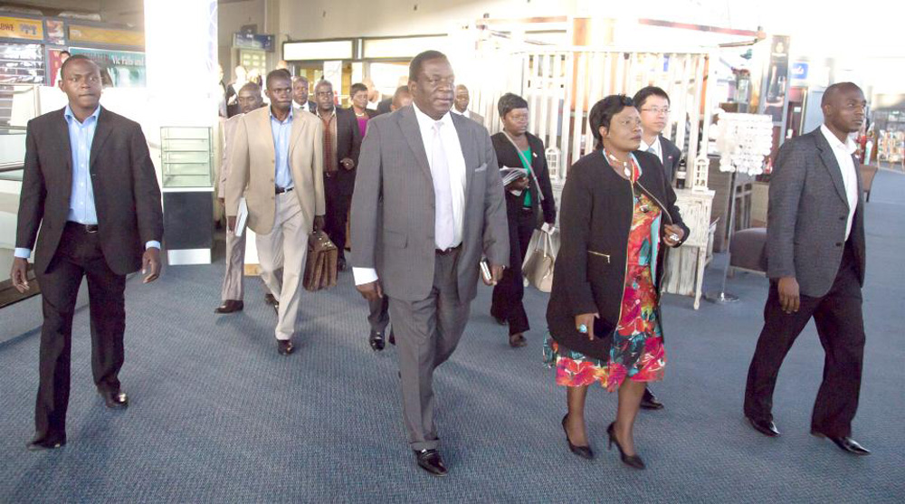 图:2015年7月,时任津巴布韦副总统的姆南加古瓦(前排右三)在哈拉雷机场启程访问中国 新华社