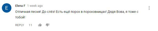 网友“Elena F”留言说:“好赞的歌!听到流泪!火药桶中还有火药(出自果戈里著作,意思是犹有余力,还有继续战斗的力量。)普京伯伯,我也与你在一起!”