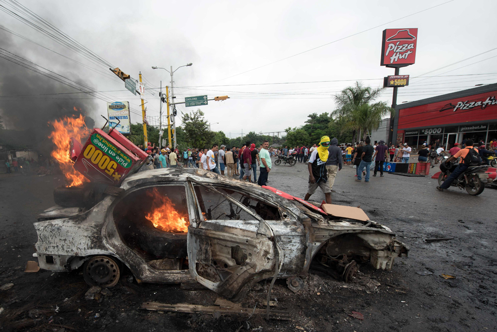 图:洪都拉斯反对派支持者1日在街头燃烧汽车抗议/法新社
