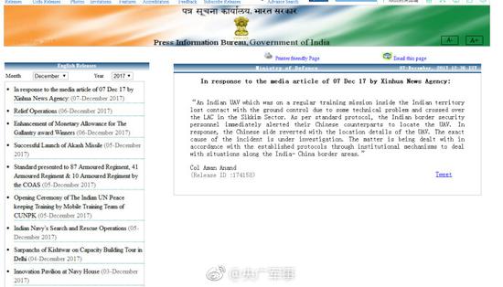 新华社电 印度国防部北京时间12月7日15时零六分发表了一份声明,回应中国关于“印度无人机入侵中国领土并坠毁”的谴责,承认这一事件发生。印度国防部在回应的声明中称,“一架印度无人机在印度领土内进行常规训练时,因出现技术问题失去了与地面控制的联系,并跨越了锡金段的实际控制线。”按照双方的标准协议,印度边境安全人员立即通知中国的边防同行定位无人机。作为回应,中方将印度无人机的位置等细节回复给印方。目前事故的确切原因正在调查中。国防部在声明中说:“印中正根据双方机构签订的相关协议机制来处理这一发生在印中边境的问题。