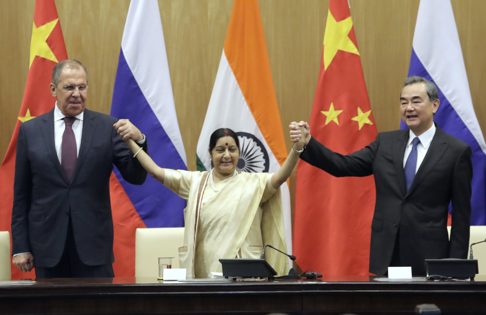 图:11日,中国外长王毅(右)与俄外长拉夫罗夫(左)和印外长斯瓦拉杰出席中俄印外长会晤后的新闻发布会/美联社