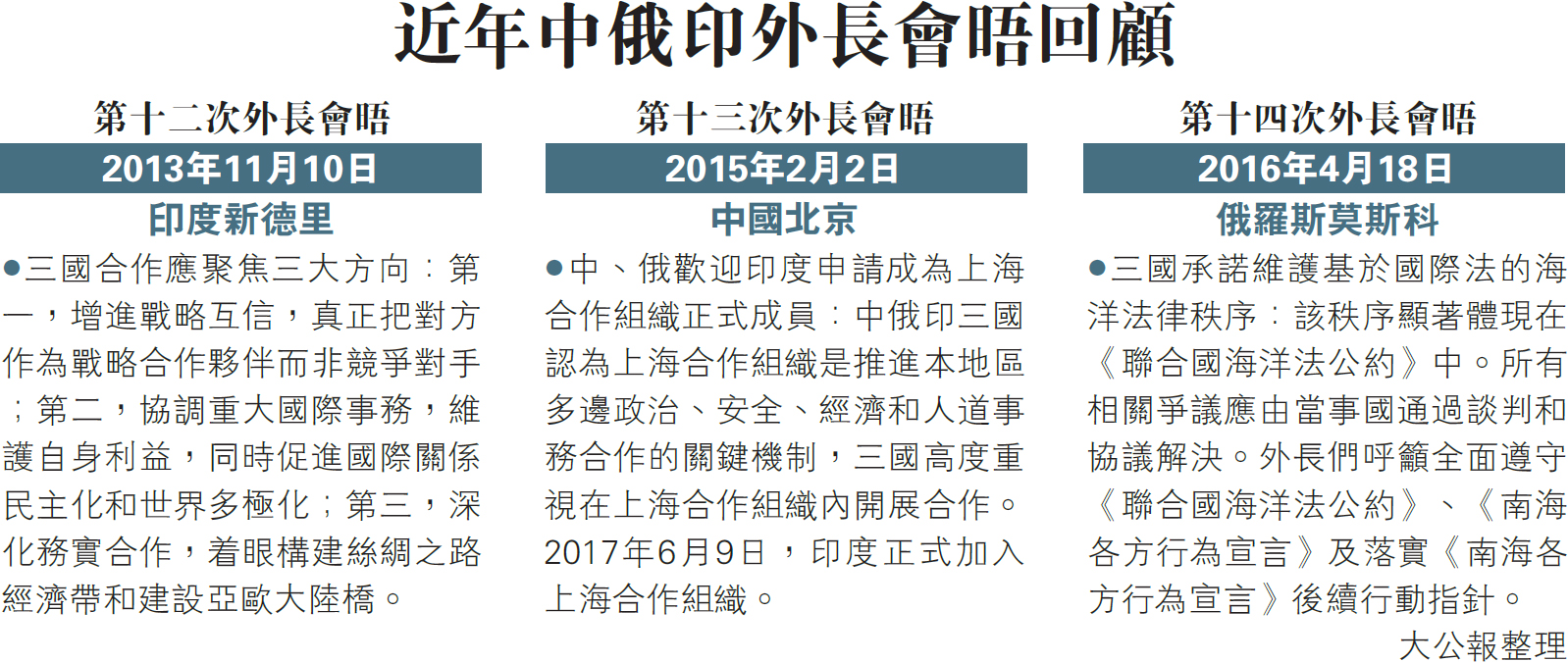 自2002年以来,中俄印三国外长会已举行十五次。这一三国合作机制最初借助其他会议平台、以非正式会晤形式举行。譬如,2003年和2005年的会晤放在联合国大会期间,2004年则安排在哈萨克斯坦阿拉木图举行的亚洲相互协作与信任措施会议(亚信会议)期间。2005年之后,三国外长会脱离其他会议平台,成为一种独立、固定的多边会晤机制。
