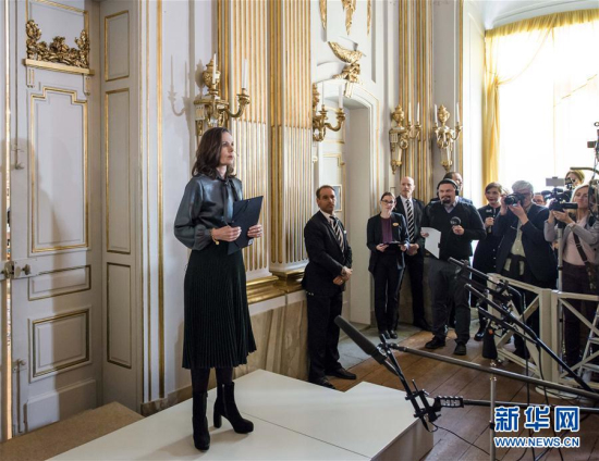 10月5日,在瑞典首都斯德哥尔摩,瑞典文学院常任秘书萨拉·达尼乌斯(左一)在新闻发布会上公布诺贝尔文学奖获得者。瑞典文学院5日宣布,将2017年诺贝尔文学奖授予日裔英国作家石黑一雄。新华社发(石天晟摄)