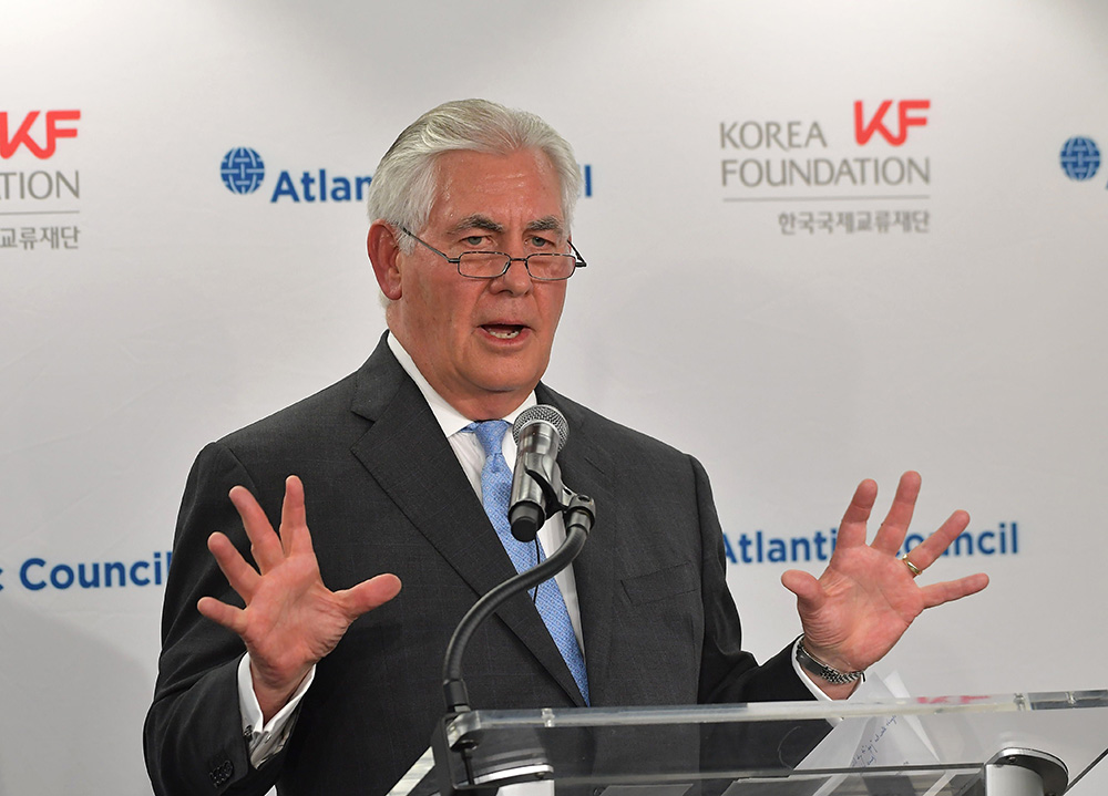 图:美国国务卿蒂勒森12日在华府大西洋理事会上发言/法新社