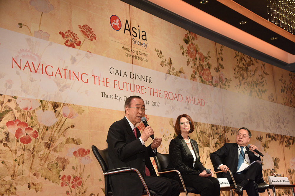 联合国第八任秘书长潘基文自14日开始访港三日,当天晚上与澳洲前总理朱莉亚.吉拉德,共同出席亚洲协会香港中心主办的《航行未来:前进之路》晚宴,并发表讲话。