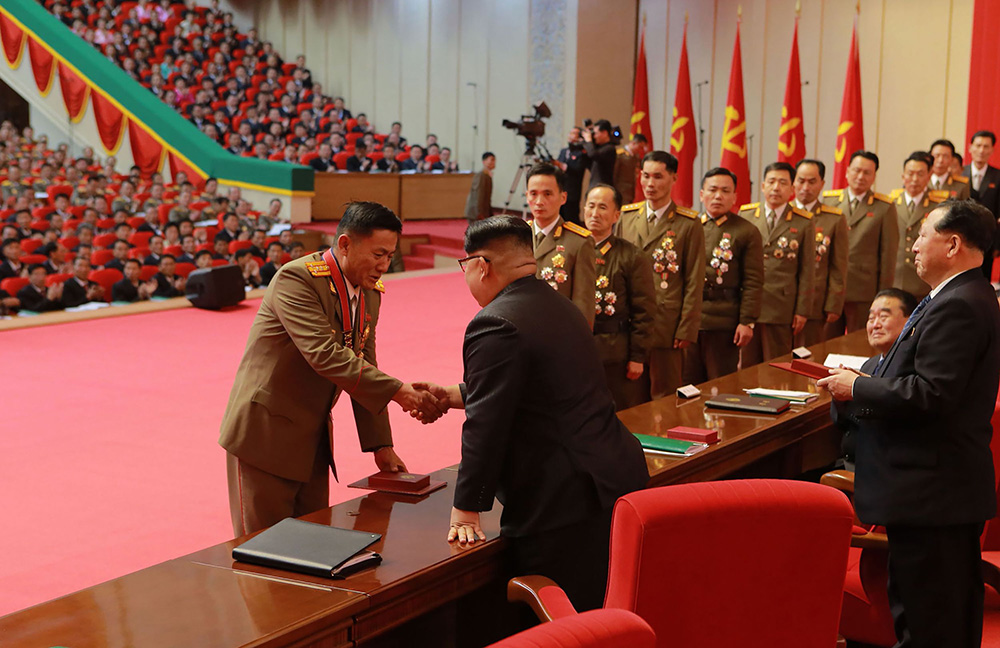 图:朝鲜领导人金正恩(左二)为研发“火星-15”导弹的科学家颁发奖章/法新社
