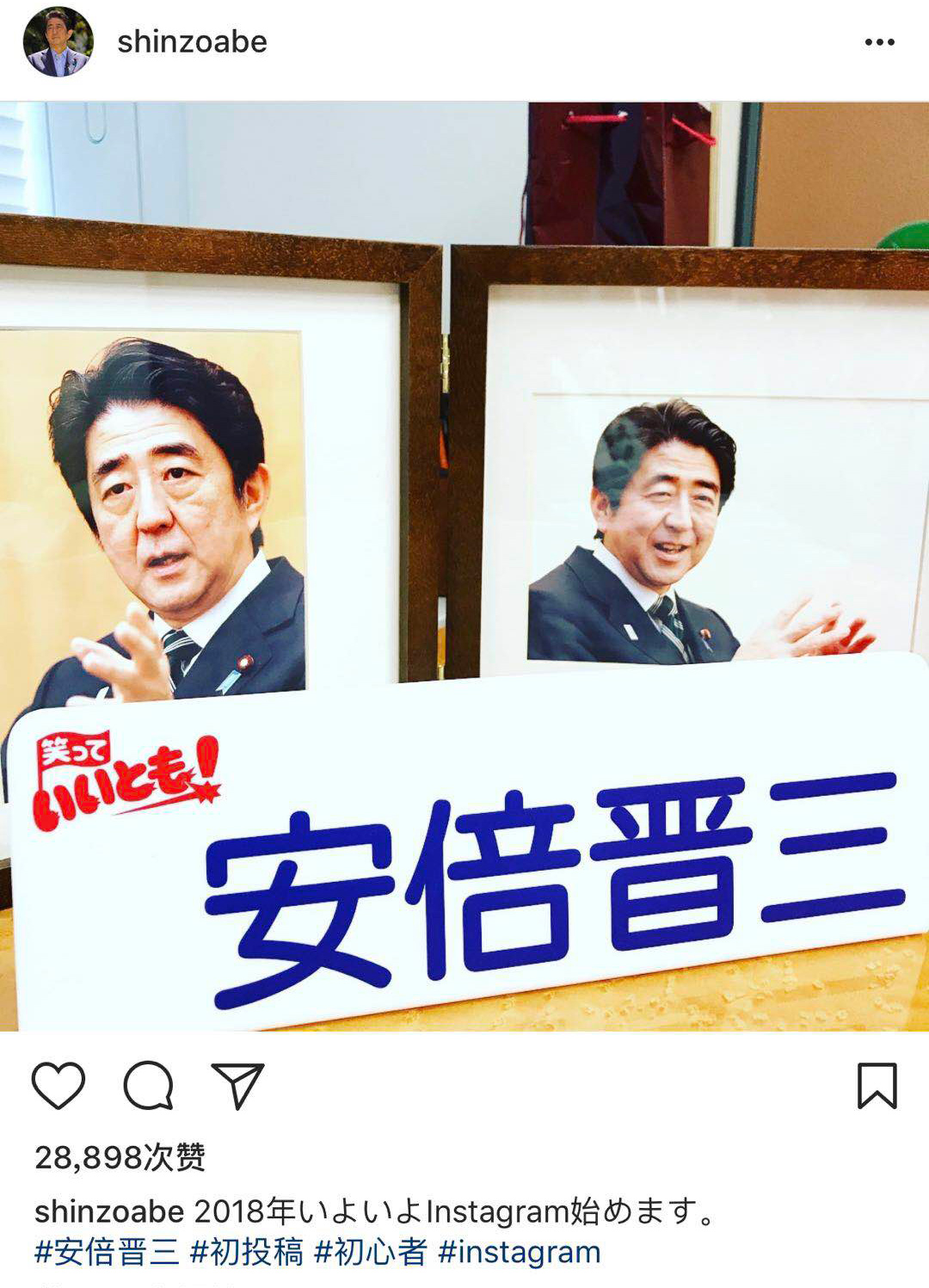 安倍在首条内容上发布了自己此前参加综艺节目时使用的姓名牌和照片。他表示,“2018年,我终于也要开始使用Instagram了。”