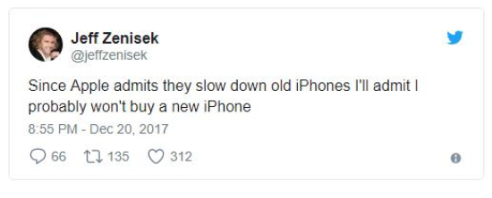 Twitter用户表示:“由于苹果承认他们放慢了旧iPhone的速度,我承认我可能不会购买新的iPhone。”