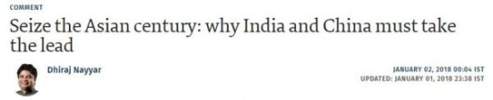 这篇评论出自印度著名智库,改造印度国家研究院(NITI Aayog)的学者迪拉杰·纳亚尔之手。他相信,在全球政治经济格局发生重大变革的时期,印度和中国作为经济高速增长的新兴国家,应该摒弃对抗思维,开拓经济合作的潜能,“联手引领亚洲世纪”。