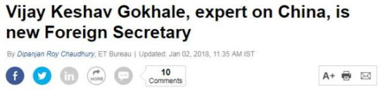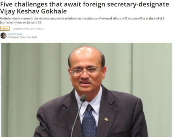 今天(2日)的印度媒体上,印度资深外交官顾凯杰(Vijay Gokhale)被任命为新任印度外交秘书的决定,引发各方猜测。