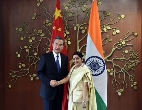 2017年12月 外交部长王毅在新德里出席中俄印外长第十五次会晤期间会见印度外长斯瓦拉吉。(图源:中国外交部)