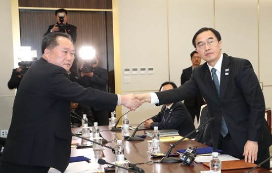 资料图片:1月9日,在板门店韩方一侧“和平之家”举行的韩朝高级别会谈上,朝方代表团团长、朝鲜祖国和平统一委员会委员长李善权(左)与韩方代表团团长、统一部长官赵明均握手。新华社/纽西斯通讯社