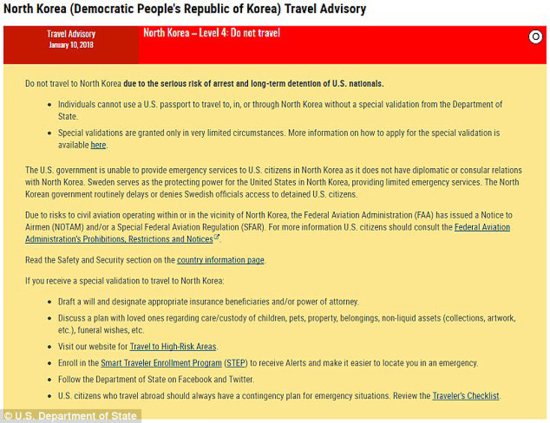 美国国务院对国民作出最严厉的警告,表示美国公民在朝鲜会有被拘捕、囚禁的重大风险,而华盛顿与平壤当局没有外交关系,无法提供紧急服务。在国务院官网上还特别註明,想前往朝鲜的人必须经过批准,才有可能在极少见的情况下出发,如获准前行,需先安排好身后事。