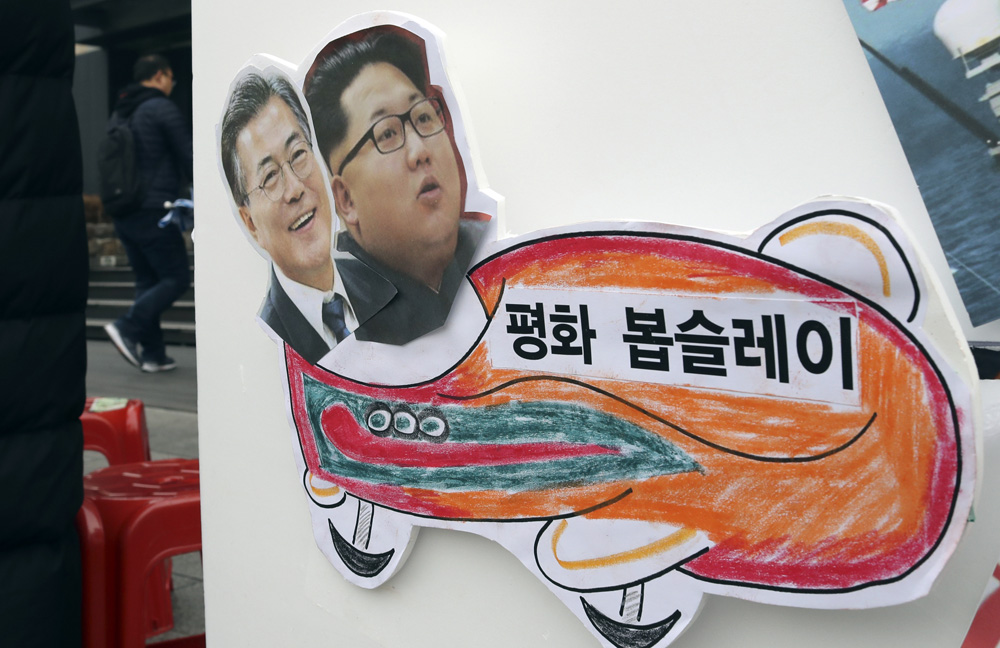图:韩国总统文在寅(左)和朝鲜领导人金正恩的图像出现在“和平冬奥会”宣传板上 美联社
