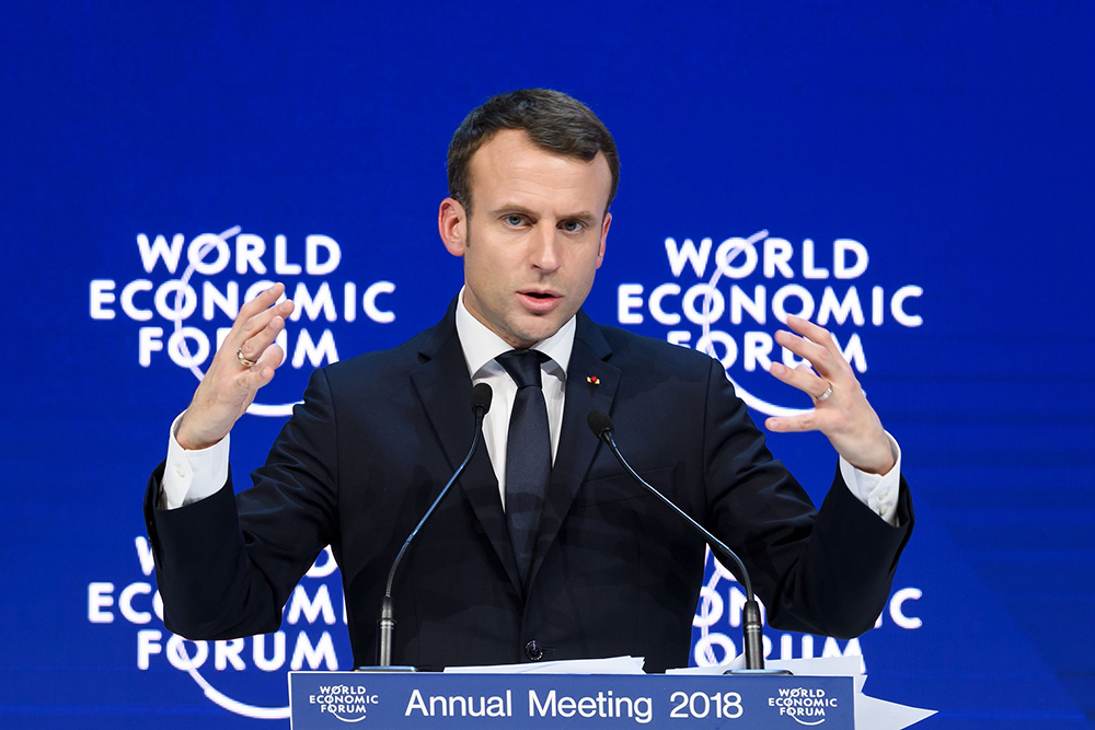 图:马克龙24日在达沃斯用英法双语演说 法新社