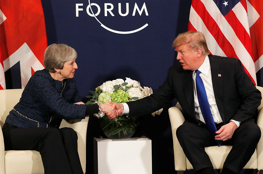 当天,特朗普与英国首相文翠珊进行了短暂的会谈,他试图澄清他与文翠珊不和的传言。特朗普说,他和文翠珊“关系很好,虽然有些人不相信。”他说我们都有共同的感觉,那就是我们“非常相亲相爱(liking each other a lot)。”特朗普说,知道有一些“错误的谣言”,他想要“改正它们。”文翠珊则说,英美“特殊关系”将持续下去。