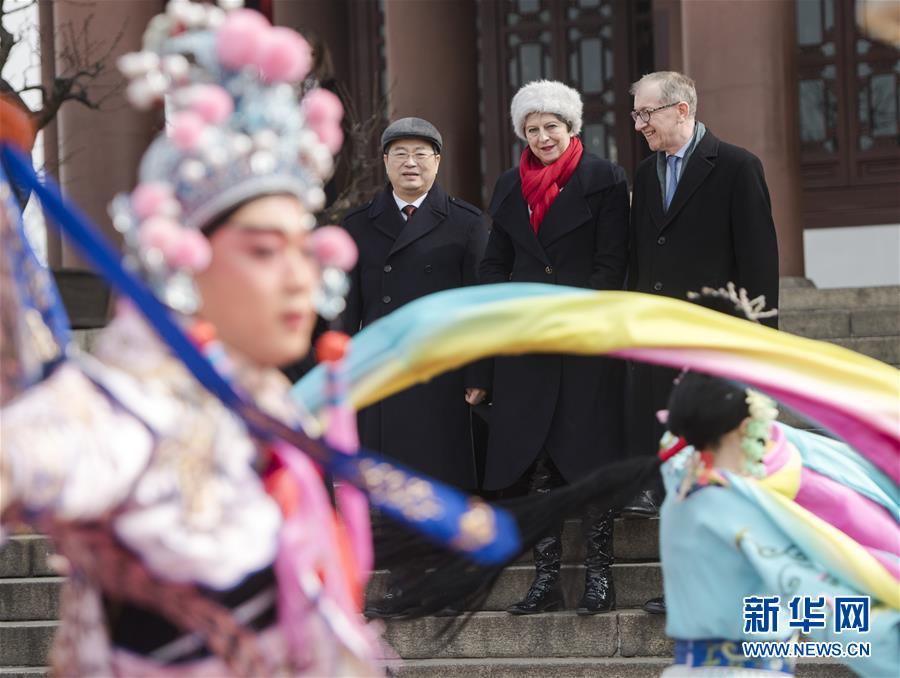 1月31日,英国首相特雷莎·梅在武汉黄鹤楼前观看京剧表演。新华社记者 肖艺九 摄