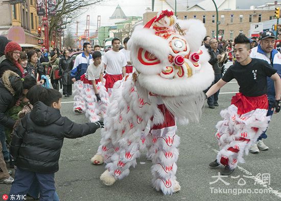 当地时间2013年2月17日,加拿大温哥华,一年一度的春节大游行在当地唐人街举行。由3000多人组成的游行队伍沿着1.3公里的路线缓慢行进,预计活动吸引了超过5万人在街道两旁驻足观看。/来源:东方ic