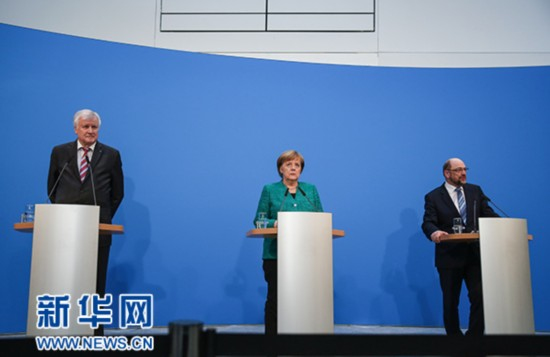 2月7日,在德国柏林的基民盟总部,德国总理、联盟党领导人默克尔(中),社会民主党主席舒尔茨(右)和基社盟主席泽霍费尔出席新闻发布会。据德国媒体报道,德国联盟党(由基民盟和基社盟组成)和社会民主党(社民党)7日就联合组阁协议达成一致。 新华社记者单宇琦摄