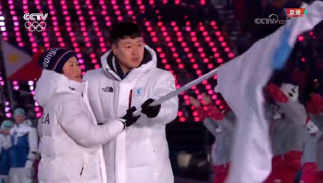 韩朝代表团共举半岛旗共同入场 图:央视新闻客户端