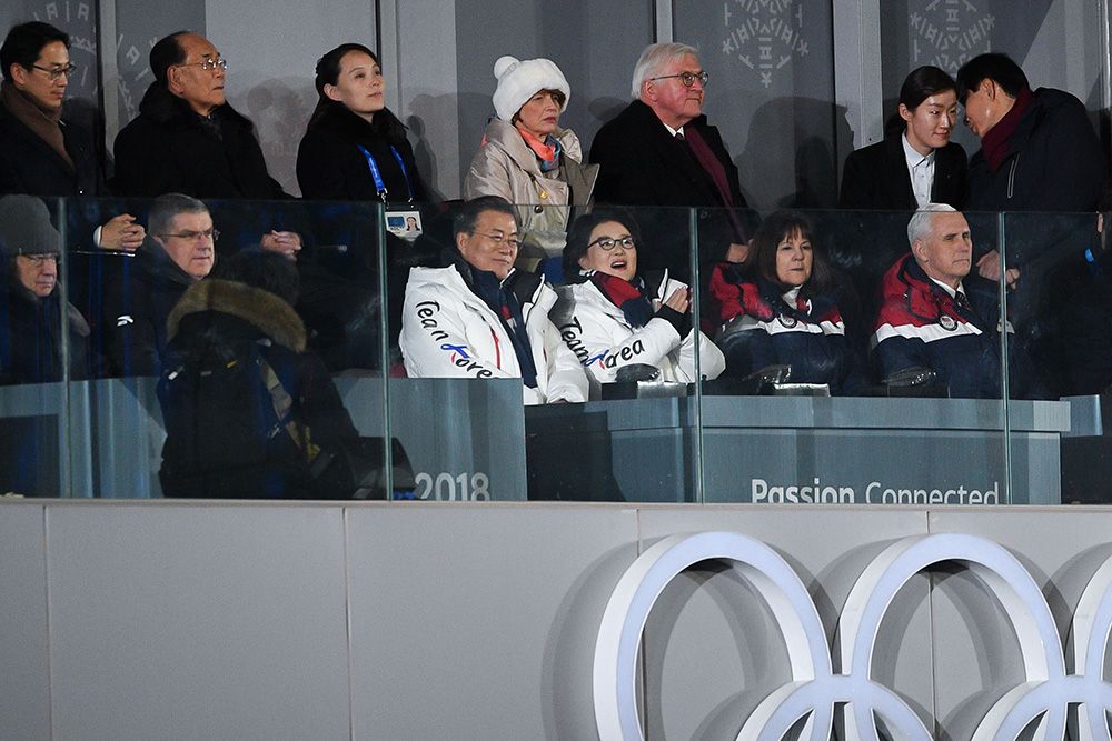 金氏家族成员首次踏足韩国土地吸引多方注意,作为朝鲜高级别代表团成员,朝鲜劳动党中央委员会第一副部长金与正与朝鲜最高人民会议常任委员会委员长金永南进入会场时,与文在寅夫妇歷史性握手并简短问候。日本首相安倍晋三也与金永南握手并简短交谈。彭斯则未与朝方代表有任何互动。