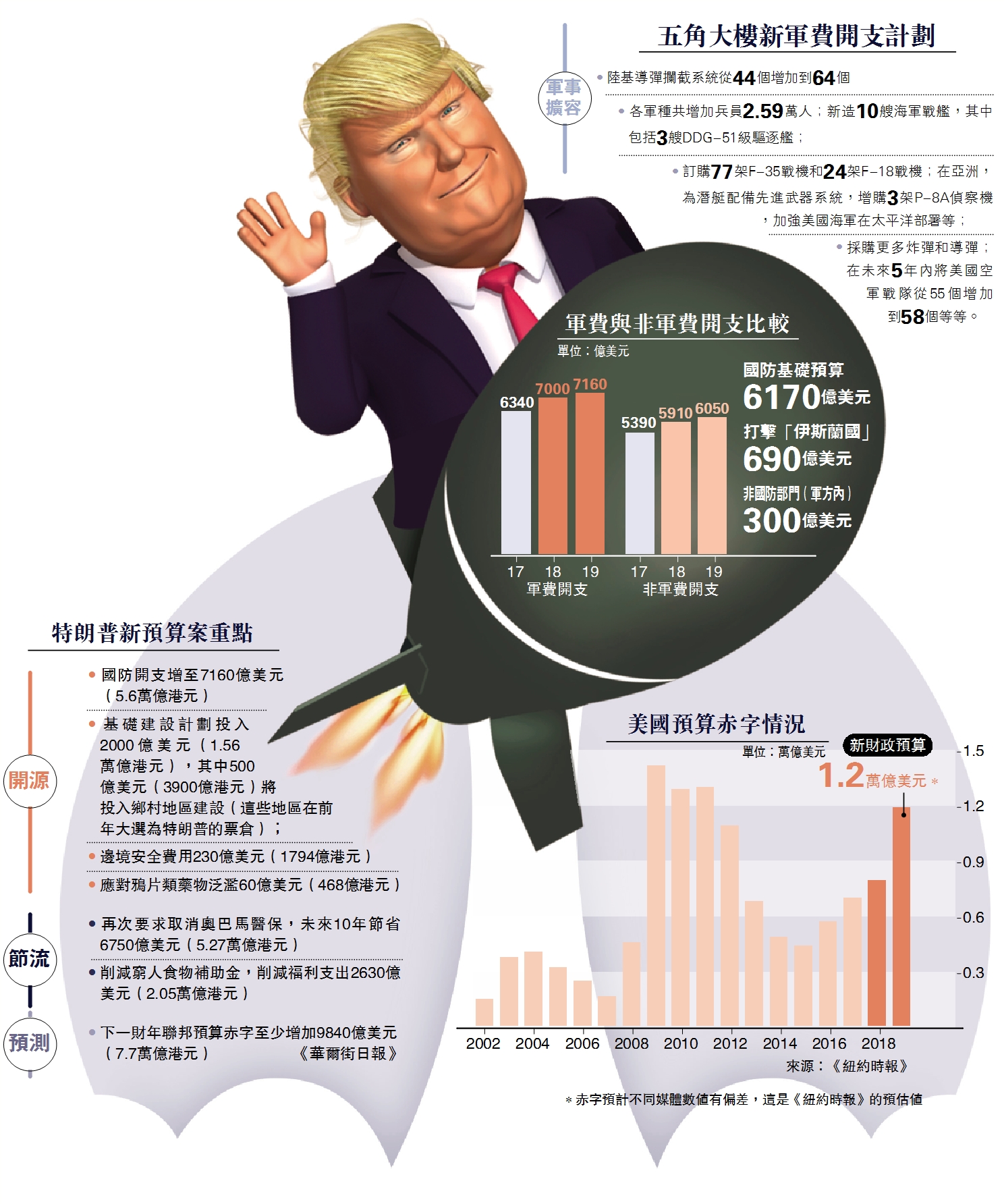 根据特朗普政府当天递交的新预算计划,美国在2019财年的军事项目支出和核武库维护费用预算,高达7160亿美元(约5.6万亿港元),增幅高达13%,创下史上最高纪录,尤其引人瞩目。特朗普政府要求战机、船舰、地面系统与导弹防御等项目进行重大投资,其中1550亿美元(约1.21万亿港元)将用于购买军备,而906亿美元(约7067亿港元)则投入研发新武器。
