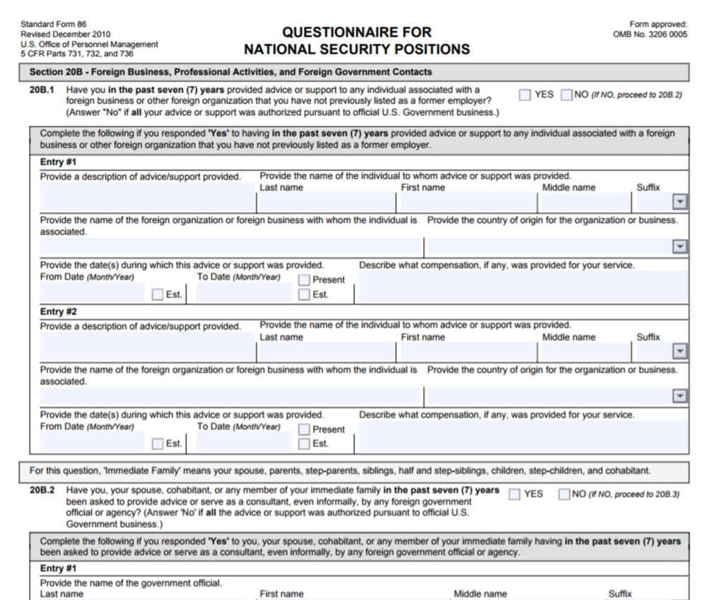 据了解,美国公民若想申请担任国家安全职务都必须提交SF86,需要填写的资料包括过去七年所有收入、住址、与申请人关联人士、曾有来往的企业机构等,且不容出错。