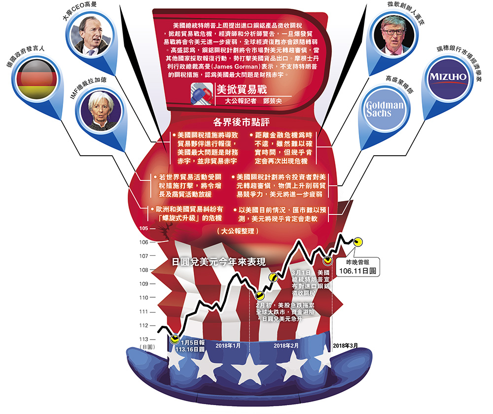 大公报3月9日讯(记者 郑芸央)美国总统特朗普上周提出进口钢铝产品徵收关税,掀起贸易战危机,经济师和分析师警告,一旦爆发贸易战将会令美元进一步疲弱,全球经济復甦亦会跟随转弱。高盛认为,钢铝关税计划将令市场对美元转趋审慎,当其他国家採取报復行动,势打击美国货品出口。摩根士丹利行政总裁高曼(James Gorman)表示,不支持特朗普的关税措施,认为美国最大问题是财务赤字。