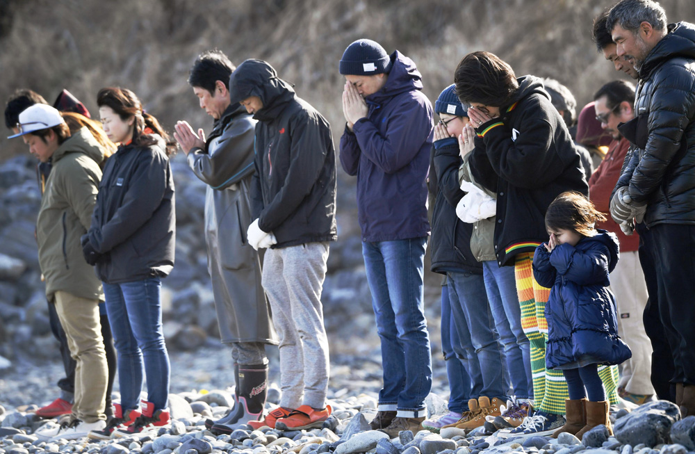 图:日本北部气仙沼市市民在纪念仪式上祈祷/美联社