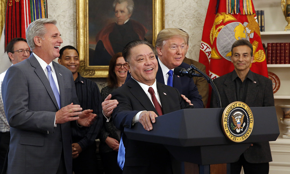 图:去年11月2日,博通CEO陈福阳(前左二)在白宫见特朗普时,宣布了准备把总部从新加坡迁回美国/法新社