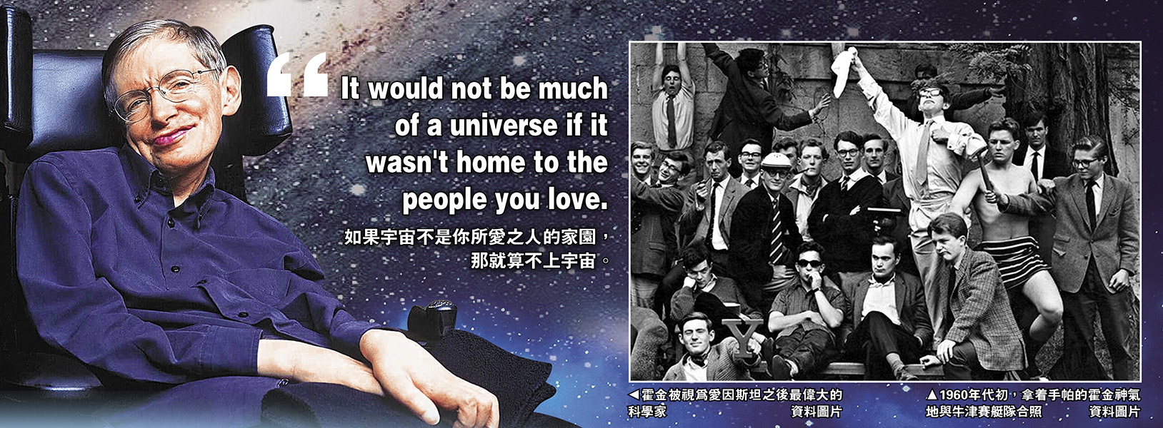 大公报讯 (记者 李 威 伦敦报道) 英国著名物理学家斯蒂芬.霍金14日凌晨在英国剑桥家中安详辞世,终年76岁,这位被誉为继爱因斯坦之后现代最伟大的物理学家,以最前沿的理论、顽强的生命力和过人的幽默而闻名于世,并激励了更多世人能够仰望星空。