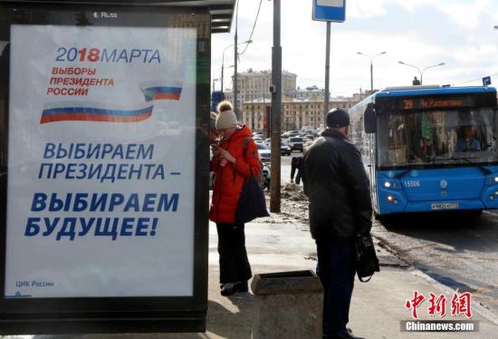 近日,莫斯科公交车站竖起了广告牌,号召民众参加总统选举投票。中新社记者 王修君 摄