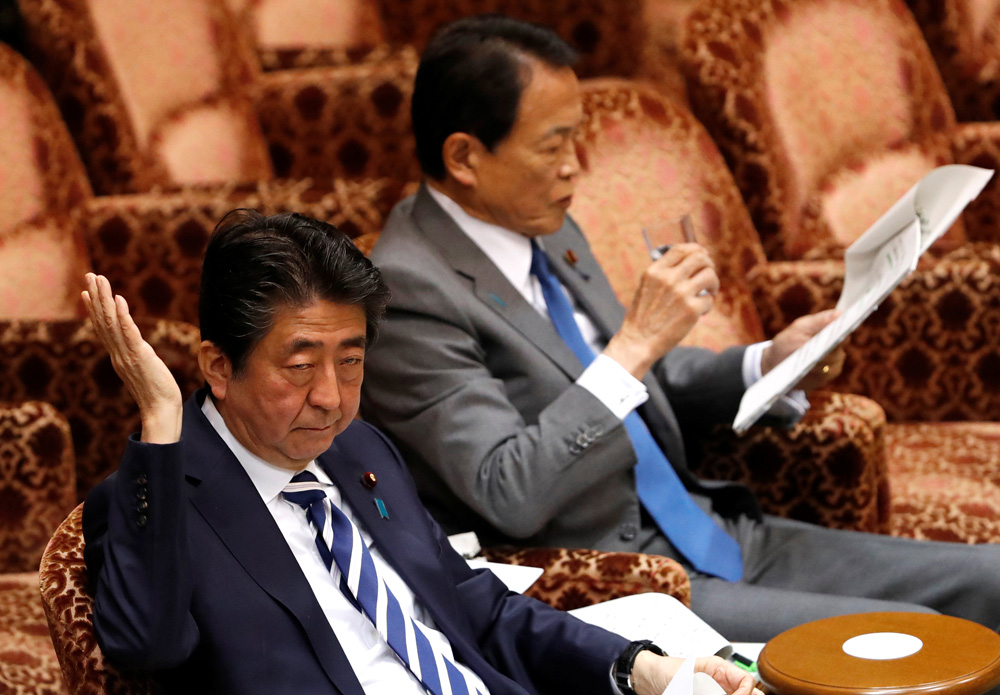 图:安倍晋三(左)19日出席参院预算委员会会议/路透社
