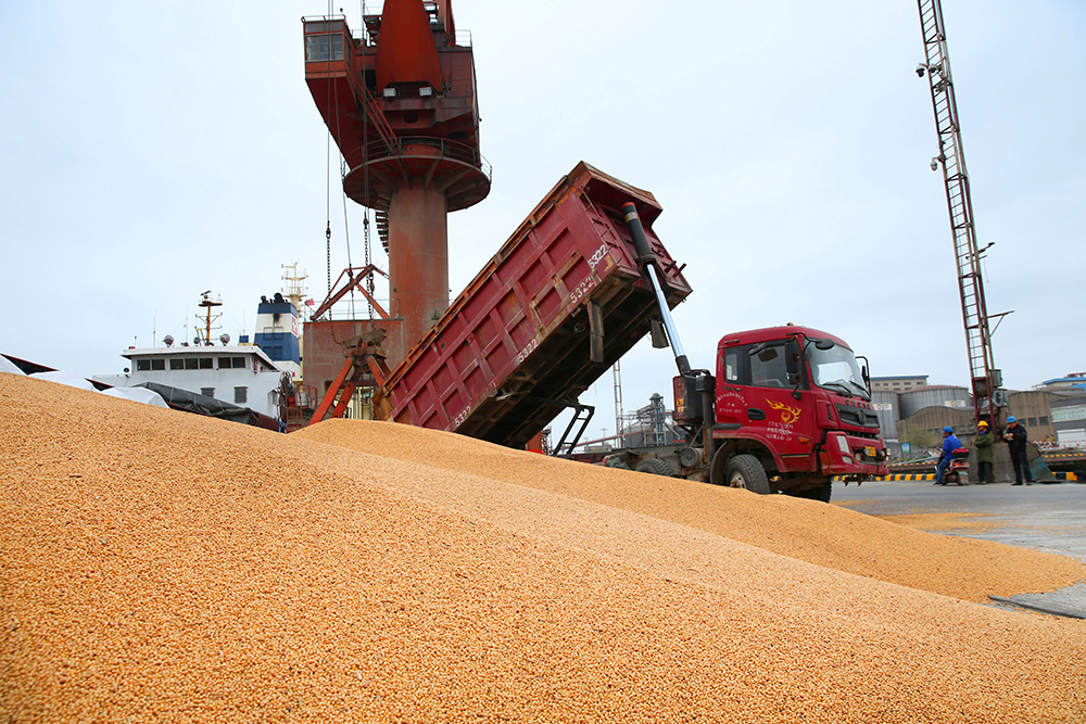 图:中国南通港口的工人正在处理进口大豆\路透社