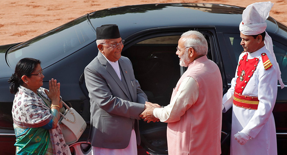 印度总理莫迪(右二)同尼泊尔总理奥利握手。/俄罗斯卫星通讯社