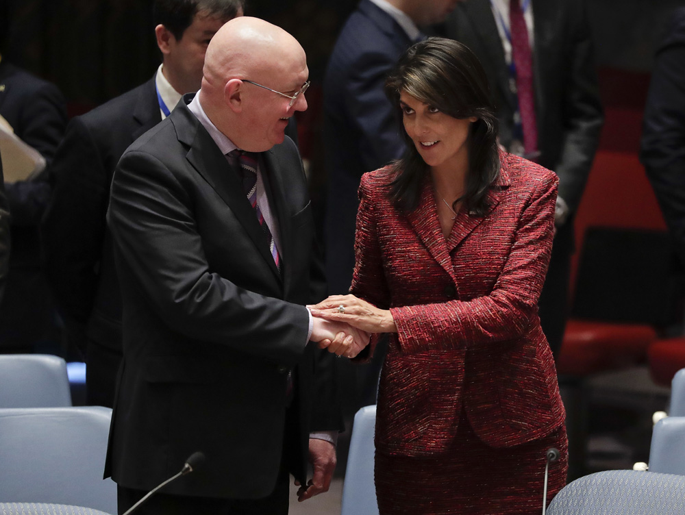 图:涅边贾(左)与黑莉10日在安理会握手交谈\美联社