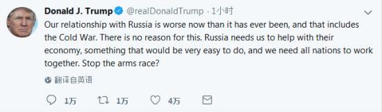 美国总统特朗普在推特上称美俄关系迎来史上最差阶段。/图片来自推特
