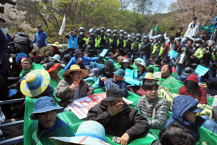 12日上午5时开始,6个“反萨”团体和150多名居民在距离“萨德”基地入口约500米的大桥上排成人墙方阵,阻止国防部向基地运入设备和建材。警方出动3000多警力尝试驱散人群。在此过程中,居民和警方均有人受伤。
