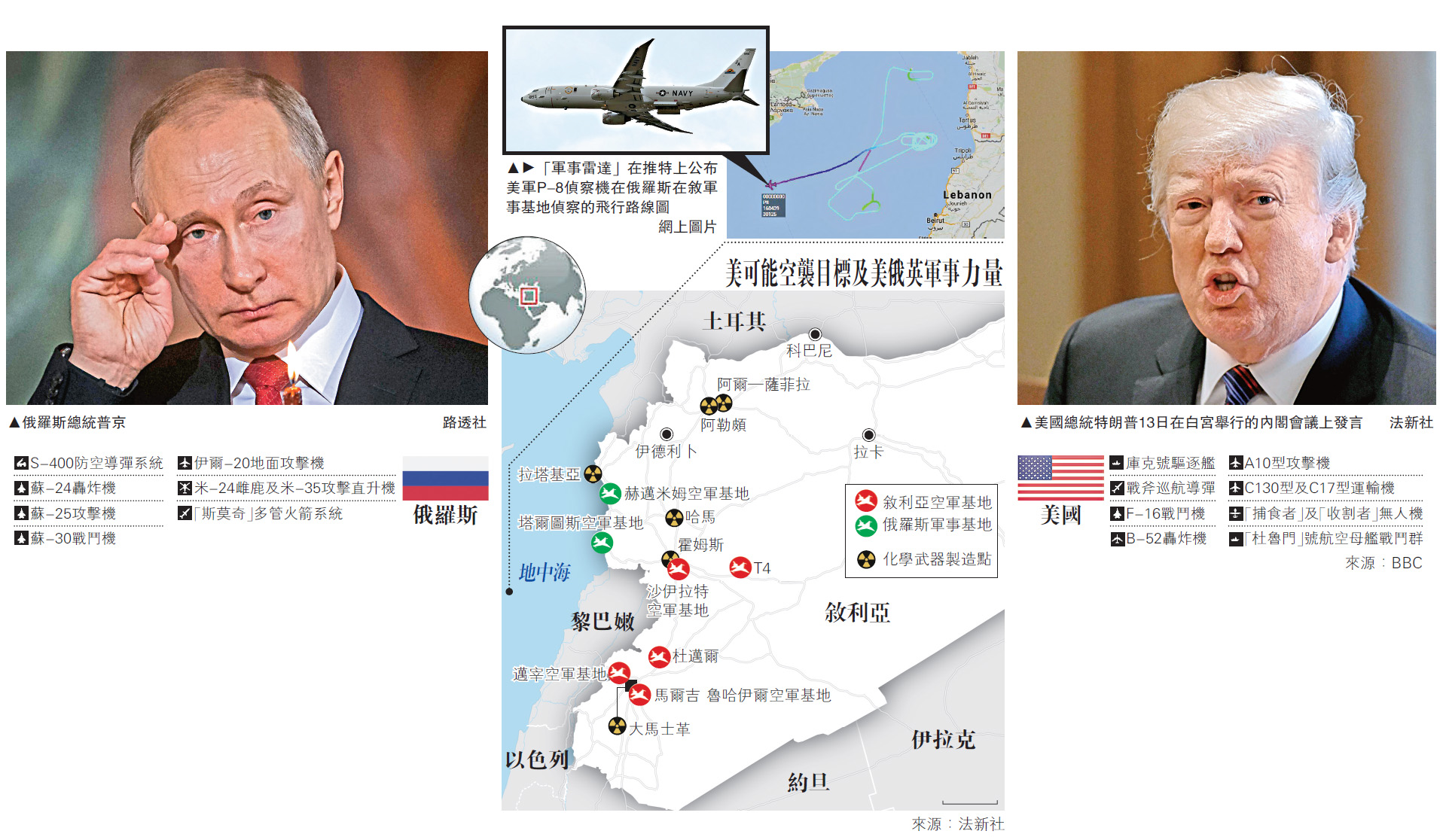 大公报4月14日讯 综合美联社、法新社、今日俄罗斯、俄罗斯卫星网报道:叙利亚局势持续紧张,美国总统特朗普据称在国安会议上提出八个叙利亚地点作为军事打击目标,俄罗斯则称侦察到七架侦察机对俄驻叙军事基地进行了抵近侦察。俄罗斯警告美国,美国如果空袭叙利亚,可能引爆美俄冲突。