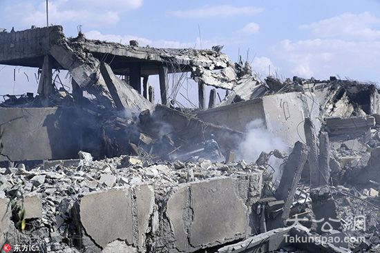 当地时间2018年4月14日,叙利亚大马士革附近的Barzeh,位于当地的叙利亚科研中心被美英法联军炸毁。/来源:东方ic
