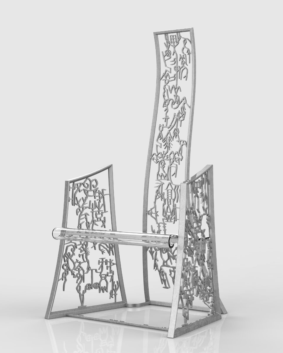 速泰熙说,仓颉椅的设计配合展览主题“花窗”。又名窗棂的花窗,“引光通风”,用传说中由仓颉创造的甲骨文取代窗棂的花格,意喻其开启文明曙光。“甲骨文是中国最早的文字,同世界任何一种文字一样,为人类脱离蛮荒”。