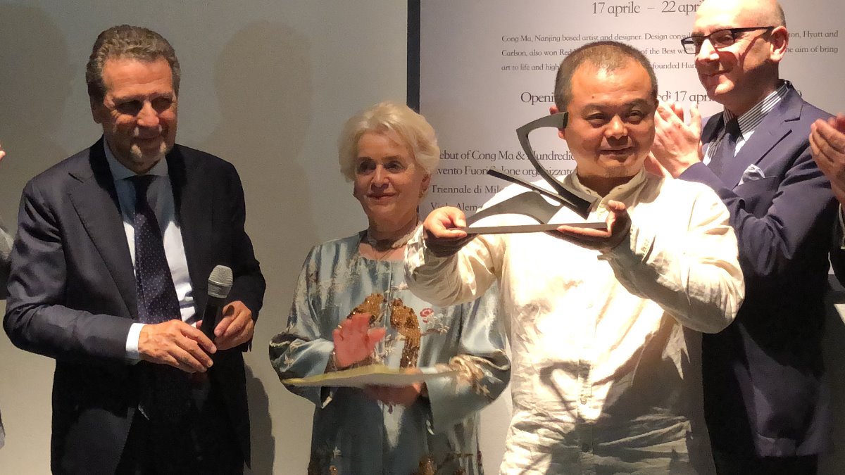 为了表彰中国设计艺术家马聪在此次米兰设计周的学术贡献、影响力,米兰三年展官方决定赠送已故著名城市雕塑艺术家CARLO RAMOUS 作品给予马聪个人(左三)。
