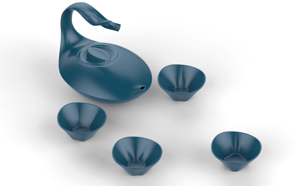 这套壶的设计师为速泰熙、马聪和作家毕飞宇,提梁取中国传统京剧“青衣”角色甩动衣袖的经典动作为意向,挺拔中含柔婉。壶纽取中国传统京剧演员的经典眉眼妆容,传递出缠绵心意。壶身取水滴之形,俯看时,壶纽与提梁相叠,如音符跃动。紫砂材质为中国宜兴紫砂泥,经1200度高温烧制。