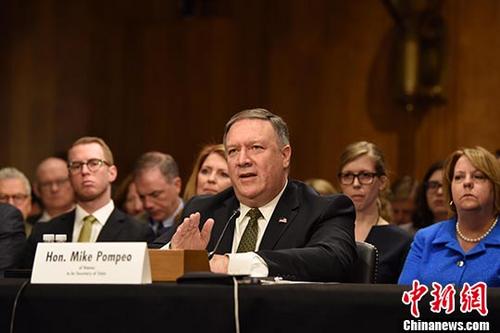 资料图:当地时间4月12日,美国参议院外交委员会就迈克·蓬佩奥担任美国国务卿举行提名听证会,图为蓬佩奥在听证会现场阐述外交政策。 中新社记者 邓敏 摄
