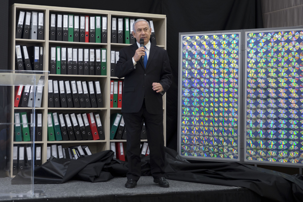 当天,内氏在以色列电视台黄金时段进行演说,他说,以色列近期在一次“伟大的情报成就”中获得数以千万计的文件,材料重达半吨。这些文件在2017年被移到一个外部看起来很破败的秘密地点。他还在现场展示据称5.5万页纸张和185张CD储存的情报。明显针对美国国内的观众的内氏,大部分时间用英语进行演说。